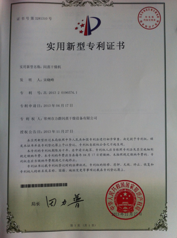 由我(wǒ)公司申請的“閃蒸幹燥機”通過國家(jiā)知識產權局的審核,並取(qǔ)得實用新型專利證書,閃蒸幹燥機專利號是:2013 -2-0196574.1