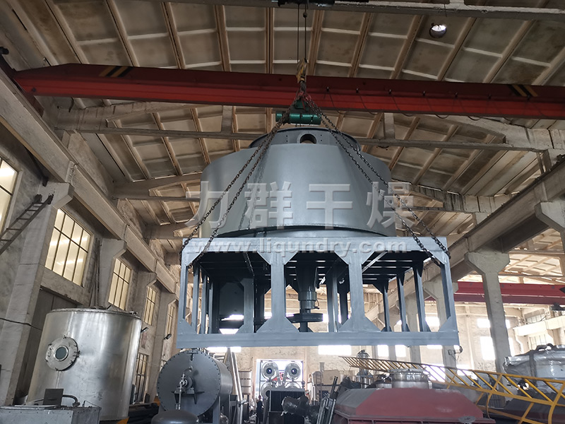 濕豆渣經脫水機去除部分水後,螺旋(xuán)輸送(sòng)至幹(gàn)燥機內,在高速旋轉攪拌槳的強烈作用下,物料受(shòu)撞擊、摩(mó)擦及剪(jiǎn)切力的作用下(xià)得到分散(sàn),塊狀物料迅(xùn)速粉(fěn)碎,與(yǔ)熱空氣充分接(jiē)觸、受熱、幹燥。脫水後的幹物料隨熱氣流上升(shēng),分級環將大顆粒截留,小顆粒從環中心(xīn)排出幹燥器外,由旋風分離器和除塵器(qì)回收,未幹(gàn)透或大塊物料受離心力作用甩(shuǎi)向器壁,重新落到底部被粉碎幹燥(zào)。