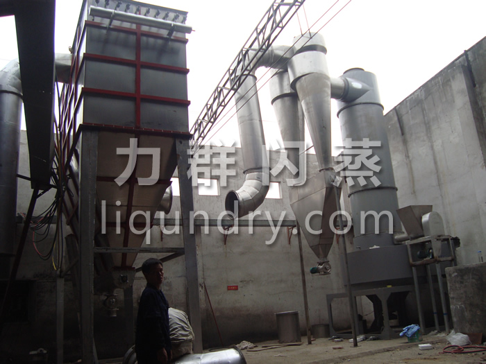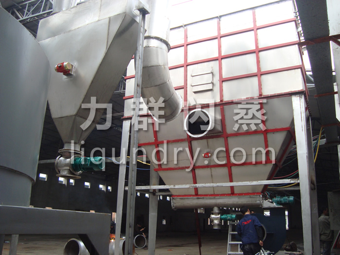 經換熱(rè)器加熱後的潔淨空氣被鼓(gǔ)入進風口,以適宜的速度(dù)旋入幹燥室底部的環隙,然後按切線方向進入幹燥室,並呈螺旋狀上升:同時,物料則由可無(wú)級調速的加料器定量加入塔內。在幹燥塔內,物料與熱空氣進(jìn)行充分、高(gāo)效的質(zhì)熱變(biàn)換,被幹燥的粉狀(zhuàng)物料隨同熱風一起輸送至(zhì)分離器,其中成品收集包裝,而尾氣(qì)則進一步經除塵裝置(zhì)處理後排空。