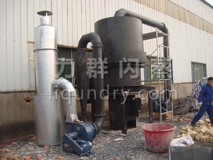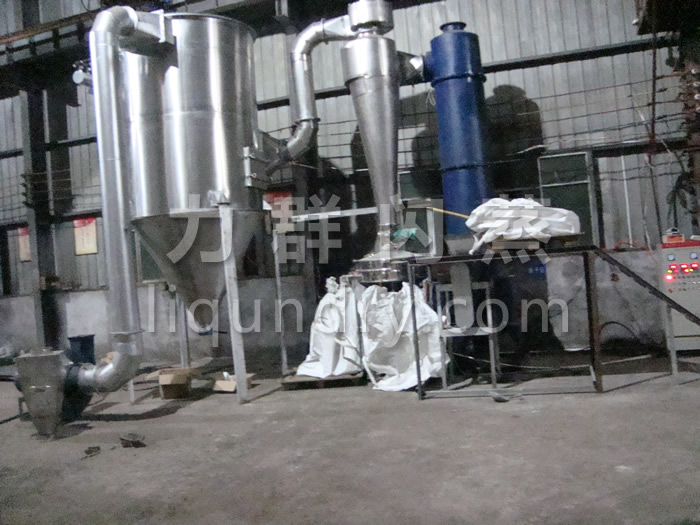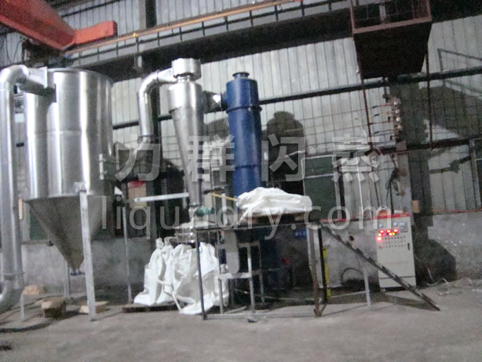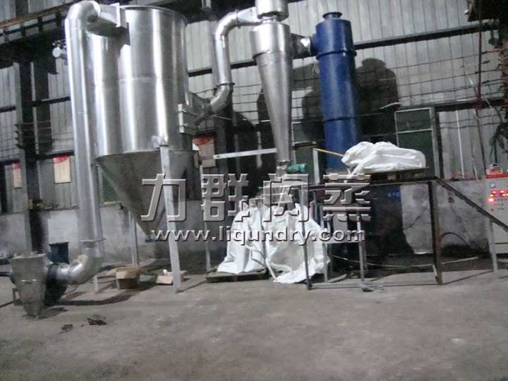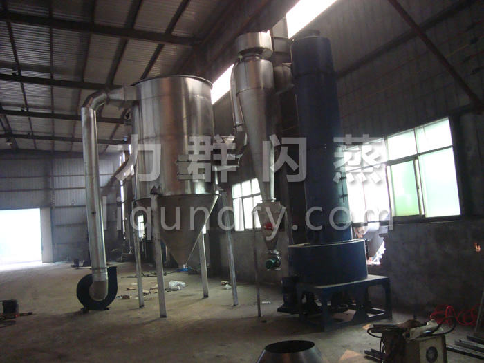 2、工作原理: 經換熱器加熱後的潔淨空(kōng)氣被鼓入進風口(kǒu),以適宜的速度旋入幹燥室底部的(de)環隙,然後按切線方向(xiàng)進入幹燥室,並呈螺(luó)旋狀上升:同(tóng)時,物料則由(yóu)可無級調速的加料器(qì)定量加入塔內(nèi)。在幹燥塔內,物料與熱空氣進行(háng)充分、高效的(de)質熱(rè)變(biàn)換,被(bèi)幹燥的粉狀物料隨同熱風一起輸送至分離器,其中成品收集包裝,而尾氣則(zé)進一(yī)步經除塵裝置(zhì)處理後排空。